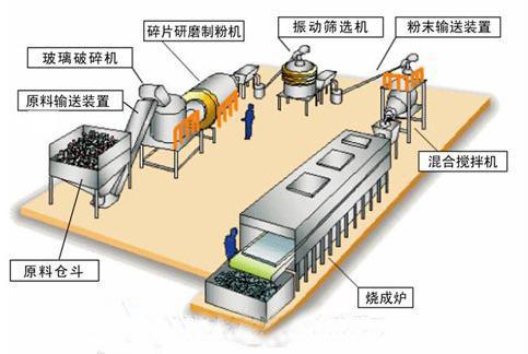 斜上皮帶輸送機(分揀、除鐵)--儲料倉--振動給料機--水篩機(碎玻璃清洗機)--斜上皮帶機--振動篩--破碎機--輸送機。